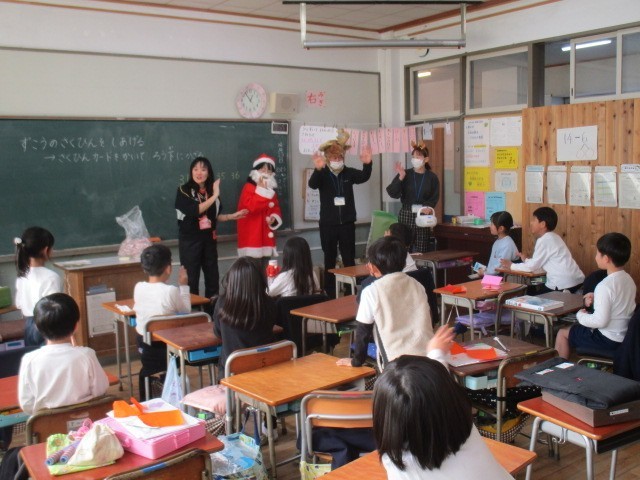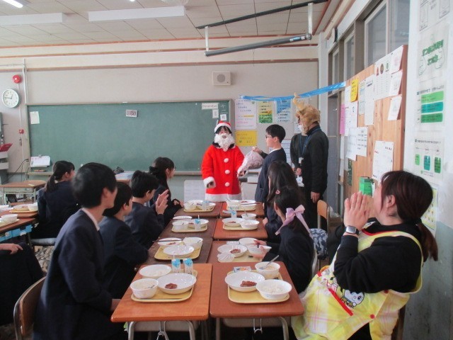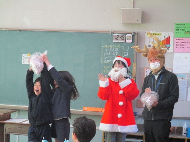 今年最後の給食となりました。もうすぐクリスマスなので、今日はクリスマス献立です。コーンチャウダーに入っている人参は、調理員さんがクリスマスをイメージして星型に切ってくれました。お楽しみのデザートは、サンタとトナカイがクリスマスの音楽と共に各クラスにお届けに行きました。デザートを受け取った子どもたちは大喜びです。給食最終日は笑顔溢れる楽しい時間となりました。