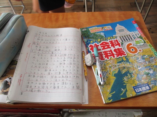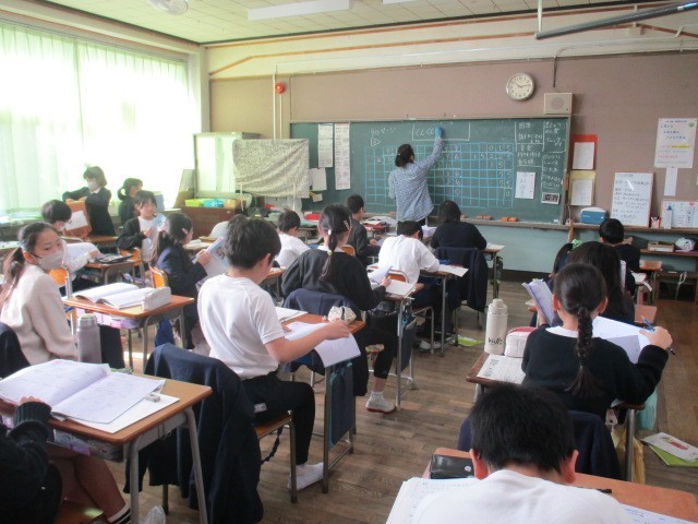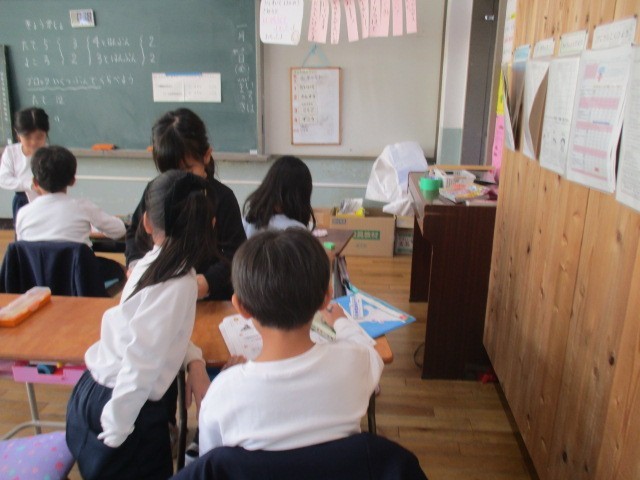 1月16日金曜日。2時間目の学習の様子です。6年は社会科で一人ひとりがまとめたノートをお互いに見て回る時間でした。友達のノートにじっくりと見入っていました。当然ながら、自分とは違ったまとめ方もあり、とても参考になるようです。4年生は算数で計算問題を解く場面です。全体で解き方を聞いたものや確認したものが本当に理解できているのか、自力で解決します。1年生の算数は、長さです。視覚でとらえたり操作を入れてたりして学習するために数図ブロックも使っていました。学習時間の最後は、問題を解きあった友達と考えを交流しています。どの学年も落ち着いた雰囲気のなかで熱心に学習している様子が見られました。