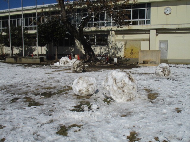 ふと、運動場に目をやると、日曜日にたくさんの人が雪遊びを楽しんだようです。様々な「作品」が残されていました。なかなかの力作ぞろいです。登校するなり「昨日、来てつくった雪だるまが残っているか見たいです。」と言う児童もいました。思わぬドカ雪に大人はてんてこ舞いですが、子どもたちは、いつもは経験できないすてきな時間を過ごせたようです。