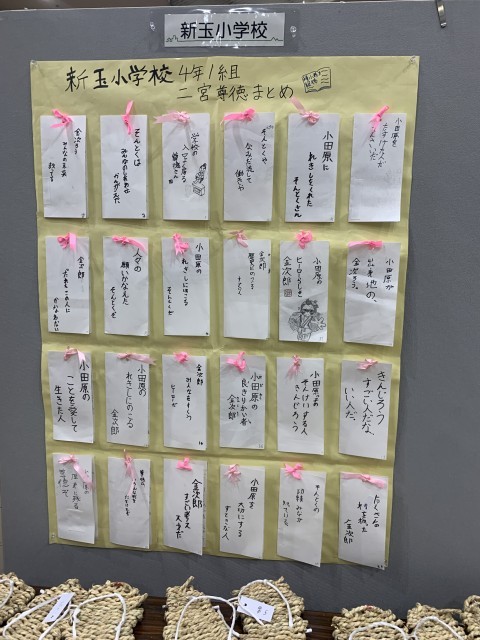 2月13日、夕方から小田原市役所2階ロビーにおいて二宮尊徳学習成果物の搬入と展示が行われました。この日は、先に展示があった12校と入れ替わる形で後半展示の13校の作品が勢揃いしました。新玉小の作品も16日(月)から26日(木)まで展示されます。時間は8時30分から17時15分までですが、最終日である26日は昼12時までとなりますのでご注意ください。小田原市役所近くにお出かけの際は、是非お立ち寄りください。4年生はもちろんですが、他学年の人でも郷土の偉人である二宮尊徳を学ぶことができる貴重な機会となることでしょう。