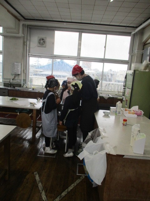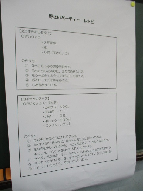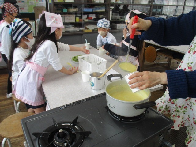 3月23日、家庭科室で2年生が「野菜パーティー」を開きました。夏野菜で収穫したカボチャをしばらくの間、冷凍保存していました。枝豆も同様です。枝豆は茹でて食べ、カボチャはスープにしました。「火は大人がやる」「歩いて移動する」などの注意事項をしっかりと守って、安全に調理をしていました。ちょっと肌寒い日ですし、年度末で給食もないため、今日のスープで心も身体も温まりましたね。