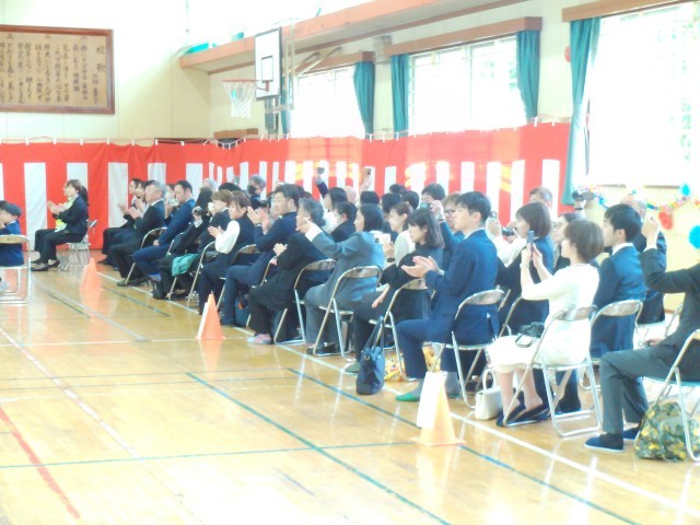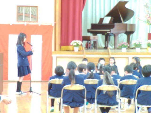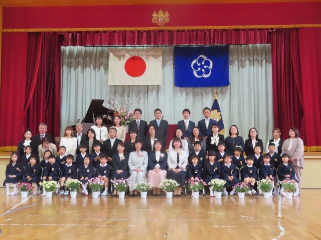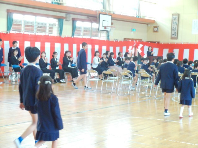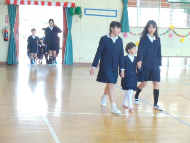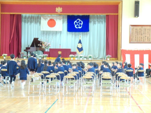 4月6日11時より入学式を行いました。雨も上がり、少し汗ばむような陽気の中で6年生に手をひかれ、1年生の入場です。来賓の皆様や保護者、在校生全員があたたかな拍手で出迎えました。式の途中で「ご入学おめでとうございます。」と言われるたびに「どうもありがとうございます。」と大きな声で言える1年生がたくさんいました。素晴らしいことです。「あさごはん・あいさつ・あんぜん」をしっかりとできるようにがんばりましょう。