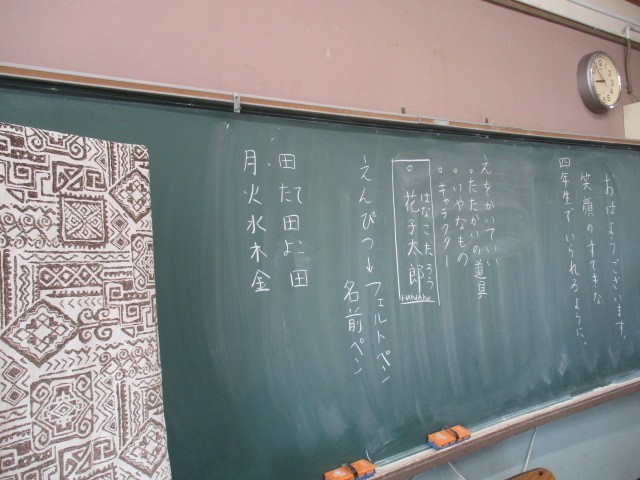 4月8日の1時間目。4年生は自分の名前を細長い画用紙に書き、丁寧に作業に取り組んでいました。日直用に掲示するのかもしれません。細かな指示が黒板に書いてあります。ふと目を移すと、「おはようございます。笑顔のすてきな4年生でいられるように」と黒板にメッセージが残されていました。朝、教室に入った児童を出迎るための言葉でしょう。今年1年間、こんなクラスになったらいいな、こんなクラスにしていきたい、という担任の願いを感じ、嬉しく思いました。おそらく教室に入った子どもたちにも伝わっていることでしょう。