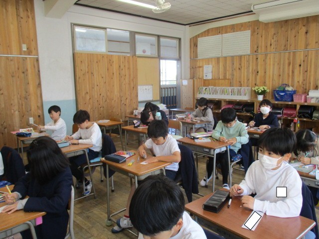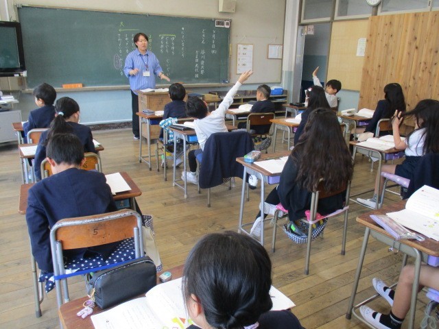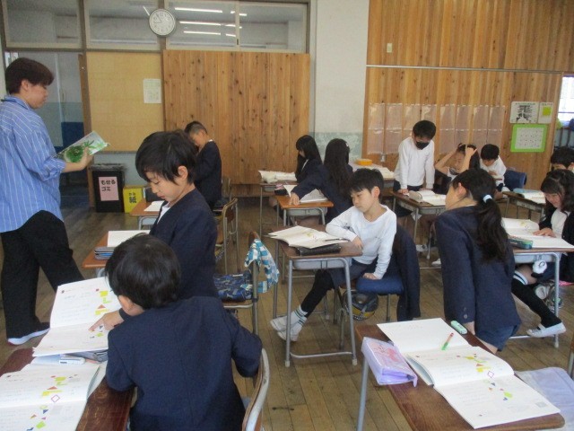 3年生は国語の時間です。谷川俊太郎作「どきん」の詩の学習です。「谷川さん。知ってるよ」「スイミー、書いた人だ。」「去年、習ったよね」「違うよ。スイミーはレオレオニさん」「あ、そうか」子どもたちの次から次へと続く話を聞いていると、こちらが吸い込まれるようです。「いんりょく」ってなんだ?詩の内容を読み取るために、子どもたちの「追究」が始まります。それぞれの学年が意欲的に取り組む姿を見ることができました。
