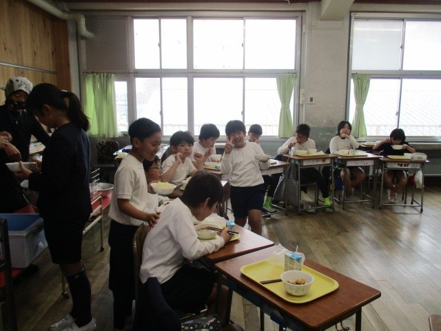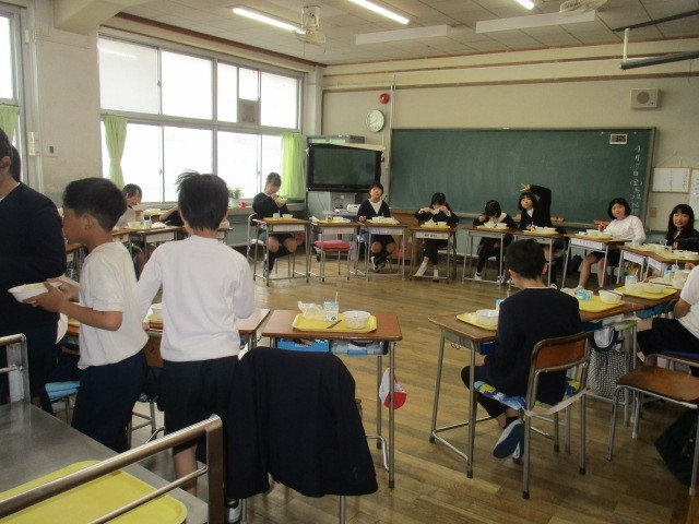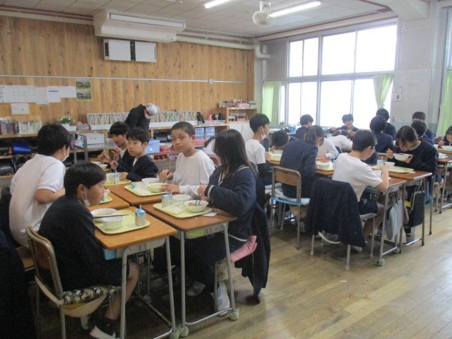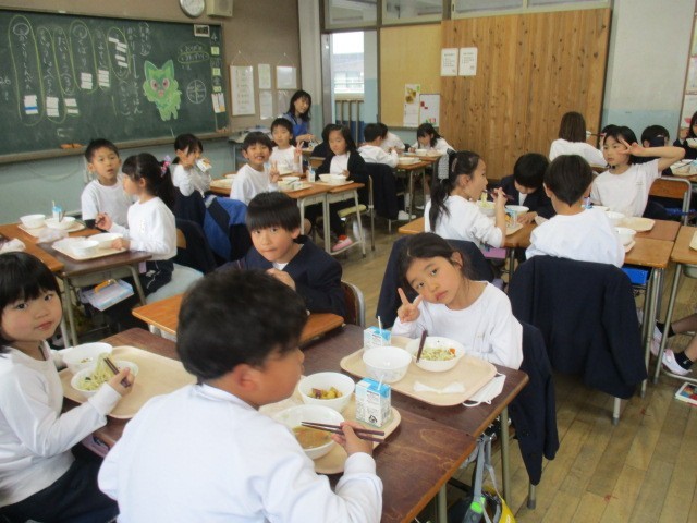 今年度の給食は4月9日から始まりました。写真は、10日の給食時間の様子です。教室内を回ってみると、担任が「おかわり」のリクエストに応じて配膳している姿を見ました。どの学年もとても落ち着いて食事をしています。なかには「校長先生、撮って、撮って!!」と「撮影」のリクエストをしてくれる児童もいました。新年度スタート、一週間が終わりました。週末はたっぷりとエネルギーを充電しましょう。来週も元気に学校に来てくださいね。