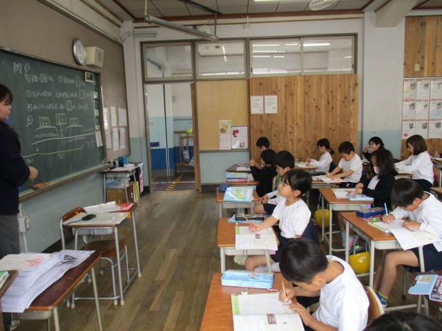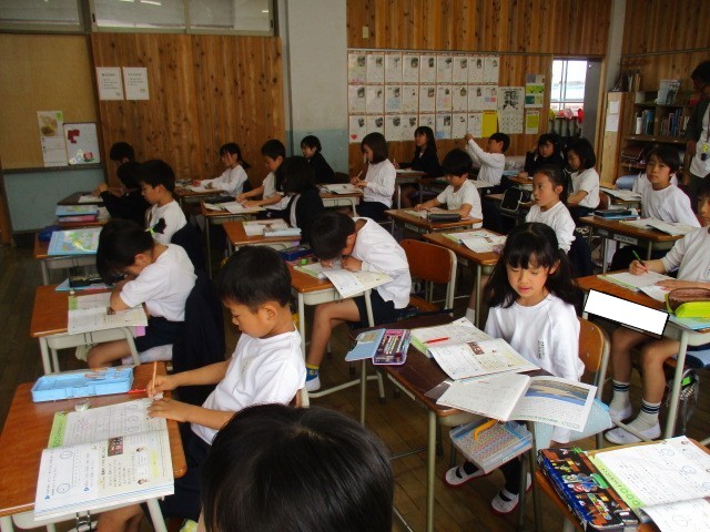 4月15日、2年生の算数です。担任は、大きな時計の模型を使ったり、教科書に書き込ませたりして学習を進めています。また、学習の終わりの方では「時刻」と「時間」の違いを確認し、言葉で定義づけることも行っていました。2年生は1年生が入学したことにより、自分たちのがお兄さんお姉さんになった、という喜びでいっぱいです。学習態度にもこうした姿があらわれています。