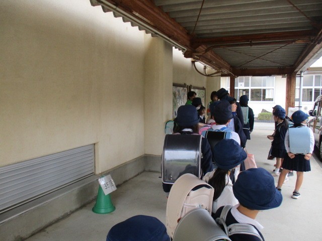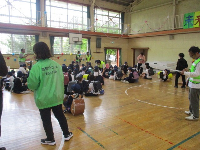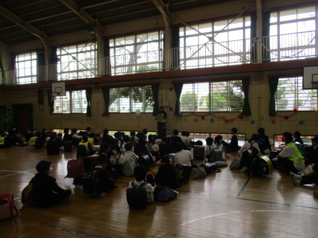 4月15日に全校児童による下校指導を行いました。1年生が加わって今年度初めてのため体育館に集合し顔合わせをしてから渡り廊下に移動しました。本校ではこの日を含めて年間3回、このような下校指導を実施します。今後、学校で緊急に集団下校を要する際には⓵さくら連絡網で保護者に知らせる②下校班ごとに集合し、人数確認をする⓷担当職員が引率する、という流れで行います。