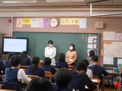 11月22日(月)6年生の総合「未来の選択肢を広げよう」で、「未来をつくる介護カフェ」の高瀬比左子さんが来校し、介護のお話とワークショップをしてくださいました。小田原にある潤生園さんも来てくださり、介護の仕事をやっていてよかったことなどを話してくれました。