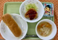今日は、さばのみそ煮が出ました。さばのみそ煮はとてもこだわって作っているメニューです。定番料理ですが、タレの煮詰まり方、トロミ具合等、調理員さんと何度も作って今日の味にたどりつきました。最初から魚を入れずに調味料をしっかり煮立たせてから入れることがポイントです。水を入れすぎないことも大事です。理想の出来上がりのさばみそになり、子どももよく食べていました。
