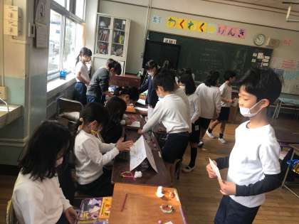 1年「あきといっしょに」 公開日 2022/11/22 更新日 2022/11/22 できごと 先日2年生のおもちゃランドに招待してもらった1年生。自分たちもお店を開いて2年生に来てもらいたいという願いをもち、集めたどんぐりや落ち葉を使ってゲームやアクセサリーなどのお店を開きました。「楽しい!」「いいね!」と喜んでもらえてとってもうれしそうでした。 いいね(0)
