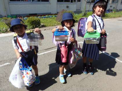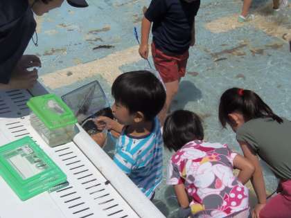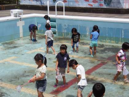 プール清掃の前、1〜3年生がヤゴ捕りに挑戦しました。登校時から虫かごや魚捕りの網など重装備でしたが、ヤゴやアメンボなどの生き物を捕ろうと闘志満々でした。清掃前なので滑って転ばないように気をつけながら、たくさんの生き物をゲットしていました。家に持ち帰った生き物はしっかりと世話をしてほしいです。