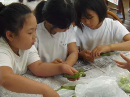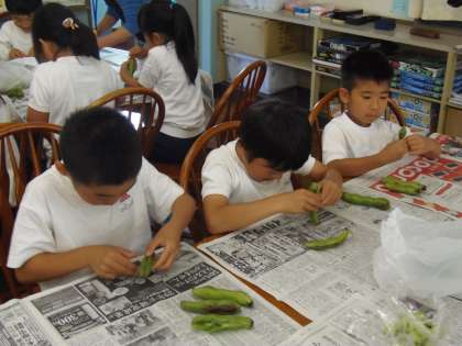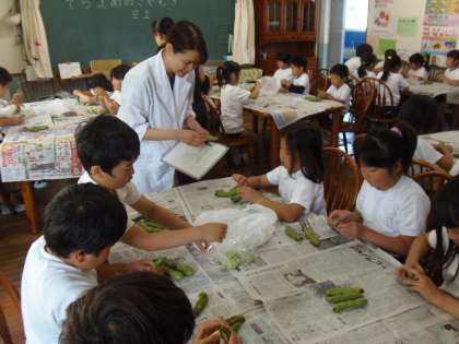 6月6日(火)2校時、2年生が「そらまめ」のさやむきに挑戦しました。食の指導「野菜について知ろう」として、栄養士の水野先生が授業を進めました。子どもたちは一生懸命さやむきを行い、全校分の給食の材料をそろえることができました。今日の給食は、きっと今まで以上においしく感じることでしょう。