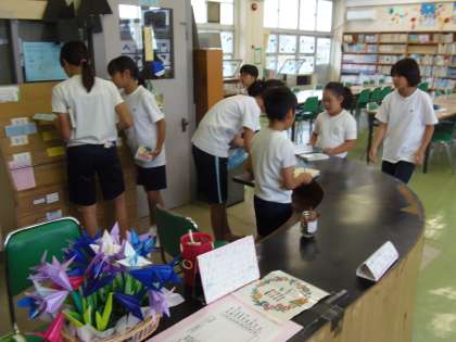 梅雨入りしました。休み時間に外で遊べなくなる分、図書室で読書したり、本を借りにきたりする子の数が増えることでしょう。毎週火・木曜日に勤務している司書の海老澤浩子先生は、図書ボランティアの皆様や図書委員会の児童と力を合わせ、図書室の環境を整え、子どもたちの読書活動を支援してくださっています。