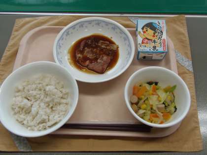 今日の献立は、麦ご飯、牛乳、ポークケチャップ、四色ソテーです。ポークケチャップは、豚肉の切り身ににんにく、ケチャップ、砂糖、酒、しょうゆ、ソースを漬け込みます。しょうが焼きのたれに似ている感じですが、ケチャップとソースを入れると洋風になります。豚肉はビタミンB1が豊富で、疲労回復に効果的ですので、梅雨のじめじめしたこの時期には積極的に摂取してほしい食材です。