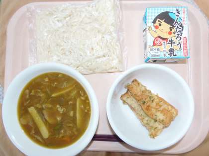 今日の給食 6月23日(金) 公開日 2017/06/23 更新日 2017/06/23 できごと 今日の献立は、牛乳、カレーなんばんうどん、ちくわのいそべ揚げです。カレーなんばんうどんは、かつおだしでだしをとり、砂糖、みりん、酒、塩、しょうゆ、カレールウを入れて、でんぷんでとろみをつけました。副菜がちくわのいそべ揚げだったので、相性が良く、汁の味も美味しくできました。給食前に子どもたちに「今日はカレーうどんだよー」と声をかけると、「やったー!」と喜んで、みんなとても楽しみにしていました。 いいね(0)