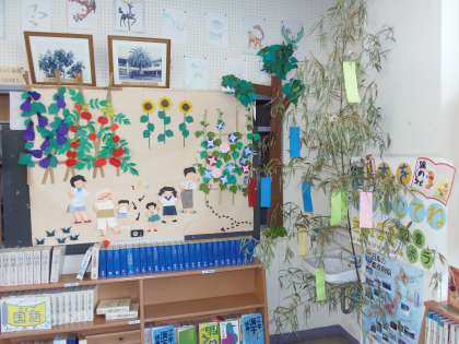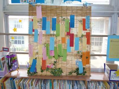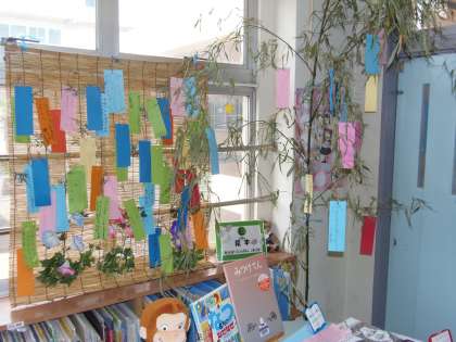 図書ボランティアの方々が、図書室に七夕を意識した飾りを作ってくださいました。短冊には子どもたちの願いが書いてあり、心温まるものや時代を反映しているもの等、様々な願い事が書かれています。