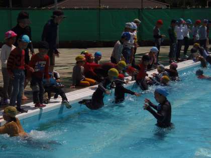 7月14日(金)1・2年生が着衣泳に挑戦しました。特に、服を着たまま水の中に入る経験のない1年生にとっては、動きにくさや体の重さなど、貴重な体験となったようです。もうすぐ夏休み。水の事故ゼロを達成する意味でも大切な着衣泳の授業でした。