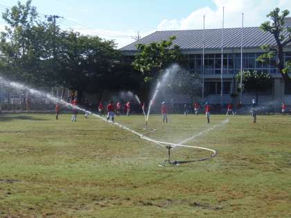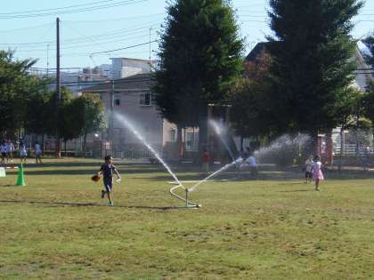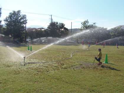 スプリンクラーを稼働させ、芝生への水まきをしました。近くにいた子どもたちが涼を求め、水浴びをしていました。子どもも芝生も水まきを心待ちにしていたようです。夏休み中もボランティアを募り、芝生への水まきを実施します。ご協力をお願いします。