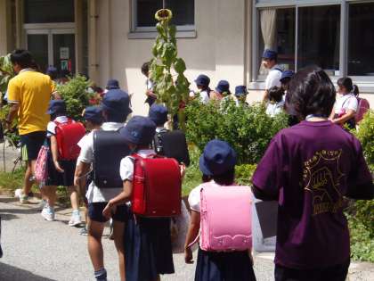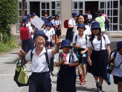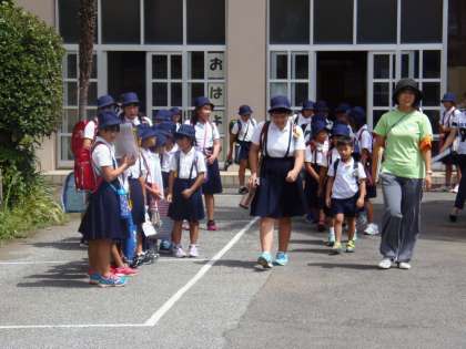 9月1日(金)夏休み明けの登校初日、帰りは集団下校を行いました。地区ごとに集まり、担当職員と一緒に危険な箇所がないか注意しながら下校しました。