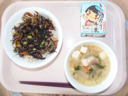 今日の給食 9月5日(火) 公開日 2017/09/05 更新日 2017/09/05 できごと 今日の献立は、ひじきごはん、牛乳、豚汁です。さくらめしという茶飯の上にひじきの煮物をかけて食べます。ひじきの煮物には、しいたけ、鶏肉、にんじん、さつま揚げ、枝豆と食材の種類を多く使用しました。枝豆とにんじんが入ると、彩りが良くなります。茶飯の上にかけると、相性がバッチリです。豚汁の中に入っている小松菜と、ひじきごはんのひじきでカルシウムをたっぷりと摂取できます。 いいね(0)