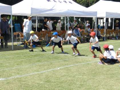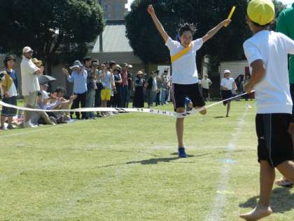 運動会最後の種目は全校リレー。1年間を通じて取り組むようにしている種目で、1年生から6年生までの全校児童(210名)がバトンをつなぎます。最後まで目が離せない接戦でしたが、黄組が優勝しました。そして、16日(土)の運動会では4位だった青組が総合優勝を飾りました。