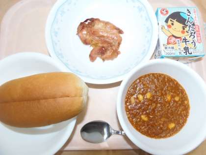 給食 9月28日(木) 公開日 2017/09/28 更新日 2017/09/28 できごと 今日の献立は、チリビーンズサンド、牛乳、レモンチキンです。普段、食べることが少ない大豆をチリソースで味付けして煮込みました。チリドッグ風にパンにはさんで食べます。大豆は食物繊維や鉄分が豊富です。しかし、苦手な子が多いので、色々なメニューに取り入れて、食べてもらう機会を多くするようにしています。レモンチキンは、初めにつけこむタレの中にレモンを絞って入れました。 いいね(0)
