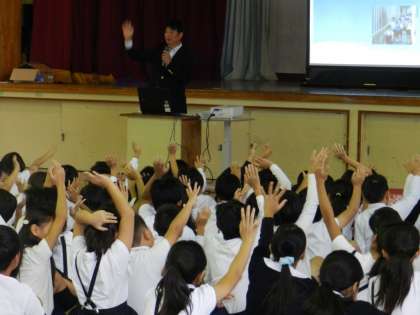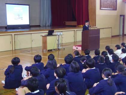 10月6日(金)前期終業式を行いました。最初に学年代表の児童の言葉がありました。学習や運動会などの行事でがんばったことについて、しっかり発表することができ、とても立派でした。次に、校長が学校教育目標等のふり返りを子どもたちと一緒にしました。朝の見守りの時間に、警察の方から「しっかりあいさつができますね」と、ほめていただいたことの紹介がありました。最後に、校歌を元気よく歌いました。
