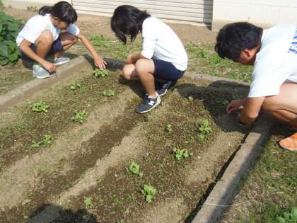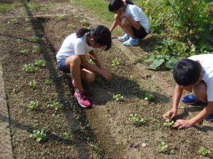 5年生が農園に大根の種を植えましたが、元気に育っています。毎日の水やりの他、今回は間引きと除草作業を行っていました。さらに元気でおいしい大根に育ってほしいですね。