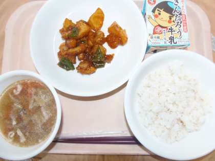 今日の献立は、麦ご飯、牛乳、海鮮チリソース、はるさめスープです。海鮮チリソースは、むきえび、いかはでんぷんをつけて油で揚げて、じゃがいも、ピーマンは素揚げをしました。チリソースを作ったところに、炒め合わせます。チリソースは、どんな食材でも合い、野菜も海鮮も一緒に合わせて摂取できるので万能です。家庭であれば、たまねぎや人参も入れて酢豚風にしても美味しいです。