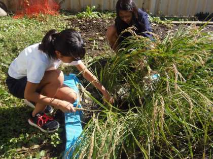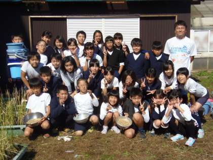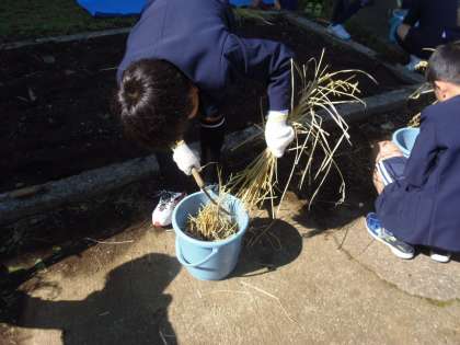 5年生がバケツ稲栽培に取り組んできました。夏休み中は持ち帰り、世話をしてきた稲ですが、今日無事に稲刈りをしました。また、学校の裏手に田んぼを作り、そこで育てた稲の刈り取りもしました。子どもたちは慣れない手つきで稲を刈っていましたが、とても楽しそうでした。今後は脱穀や精米を行い、おいしく食べることができるようになることでしょう。