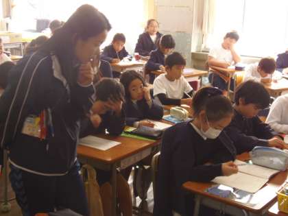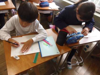 10月31日(火)4年生は算数の時間に「面積」の学習をしていました。算数TTの人見先生が主となり、富田先生と協力して授業を進めていました。前時に学んだ1㎠の何個分かを考え、長方形や正方形の面積を求めます。自立解決の時間を保障し、じっくり考えさせていました。また、ヒントカードを用意して支援をしていました。自分の考えを説明する時間を通じ、みんなで納得しながら長方形や正方形の面積の求め方を学ぶことができました。