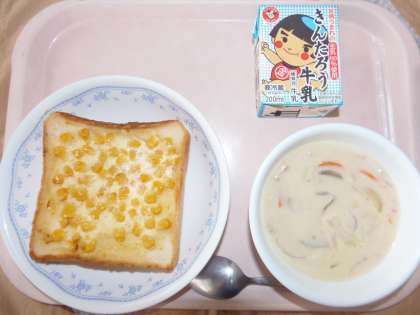 今日の献立は、マヨコーントースト、根菜のクリームスープです。マヨコーントーストは、名前のとおりマヨネーズとホールコーンを混ぜたものを食パンにのせて焼きました。見た目もきれいで子どもたちに大人気です。今週は歯の衛生週間なので、スープに、ごぼう、れんこん、さつまいもを入れて噛む事を意識する献立にしました。クリームスープなので、最後に粉チーズを入れてコクを出しています。
