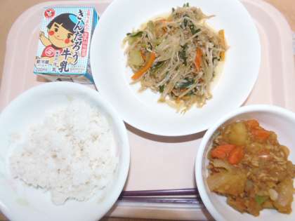 今日の献立は、、麦ご飯、牛乳、韓国風みそじゃが、もやしソテーです。韓国風みそじゃがとは、初めににんにくとごま油で野菜を炒め、調味料に赤味噌と豆板醤を使用しています。ふつうの肉じゃがと一味違い、みそ味と合って美味しいですよ。しょうゆや味噌を半分にわけて、半分を初めに入れて煮込み、もう半分を仕上げ前に入れて煮込むと美味しく仕上がります。