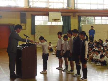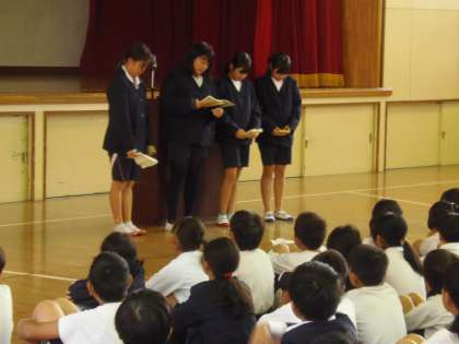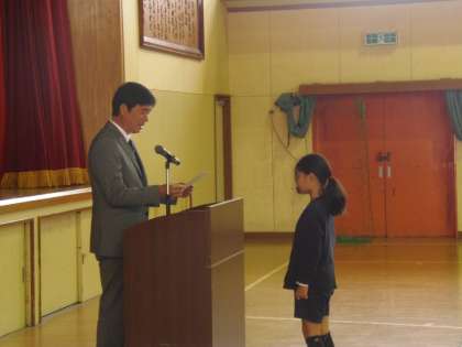 表彰後には計画委員会から、来週から取り組む「あいさつ運動」について話がありました。毎週、火曜日と金曜日に正門と七枚橋で「あいさつ運動」を行うのでご協力くださいとのことでした。元気なあいさつの輪がさらに大きく広がることを期待しています。