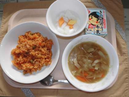 今日の献立は、チキンライス、牛乳、野菜スープ、カラフル杏仁です。今日は1・2年生の学習発表会だったので、頑張りましたの意味を込めて、デザートが出ています。色々な色の杏仁豆腐が出て、子どもたちはああ興味津々で嬉しそうに食べていました。チキンライスは人気のメニューです。