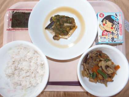 給食 12月13日(水) 公開日 2017/12/13 更新日 2017/12/13 できごと 今日の献立は、麦ご飯、牛乳、味つけのり、さばの塩やき大根おろしがけ、五目きんぴらです。さばは、しめじを炒めて、だいこんおろしを入れ、しょうゆ、酒、みりん、砂糖を熱した後に葉ねぎを入れます。さばは塩焼きや味噌煮が広く知られていますが、たまには和風おろしだれもいかがでしょうか?緑があるので、色もきれいです。 いいね(0)