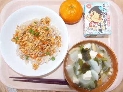 給食 12月18日(月) 公開日 2017/12/19 更新日 2017/12/19 できごと 今日の献立は、そぼろごはん、牛乳、かぶのみそしる、みかんです。みそしるには、新玉小学校の畑でとれた大根をたくさん入れました。40日大根という品種で、種をまいてから40日ほどで収穫できます。小学校の畑で採れた野菜を給食で出すことができ、地産地消を小学校の中で出来ています。大根の辛味が感じられて、みそ汁の味がより美味しくなりました。みかんも小田原市でとれたみかんが出ました。 いいね(0)