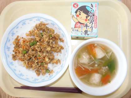 給食 1月29日(月) 公開日 2018/01/29 更新日 2018/01/29 できごと 今日の献立は、ツナの三色丼、肉団子と春雨のスープです。ツナの三色丼は、ツナ缶、にんじん、しいたけを炒めたところに炒り卵を入れて、最後にグリンピースをのせます。色どり豊かでお家にある材料で簡単に作ることができます。味つけは、砂糖、しょうゆ、塩とシンプルな味つけです。 いいね(0)