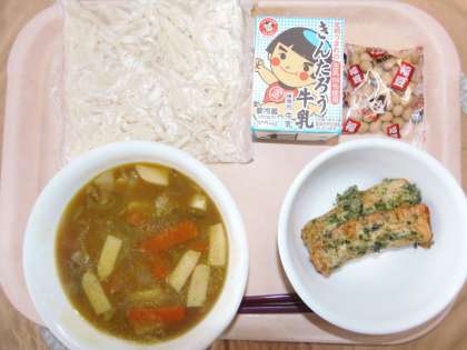 給食 2月2日(金) 公開日 2018/02/02 更新日 2018/02/02 できごと 今日の献立は、カレーなんばんうどん、ちくわのいそべあげ、福豆です。明日は、節分ということで福豆が出ました。6年生の12歳まで数えて食べられるように、個包装の袋の中にはどれも12粒以上入っています。ちくわのいそべあげに使用するちくわは鈴廣さんのちくわなので、弾力があり大きいちくわです。カレーなんばんうどんは、でんぷんを多くして冷めないようにとろみをつけました。 いいね(0)