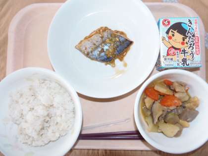今日の給食の献立は、麦ごはん、さわらのしょうゆ焼き、南蛮煮、牛乳です。