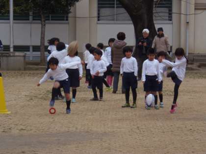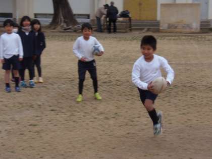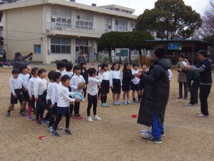 2月22日(木)放課後子ども教室が行われました。今日はラグビーチームから指導者をお招きし、ラグビーに挑戦していました。外はとても寒かったのですが、子どもたちは元気に体操したり、ラグビーボールを蹴って追いかけたりする等、運動場に元気な声が響いていました。机に向かう学習も楽しいですが、外で元気よく体を動かす学習も楽しいですね。