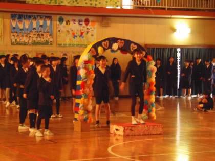 入場は6年生一人一人の紹介から始まりました。そして、6年生の思い出の曲「with you smile」をみんなで歌いました。出し物のトップバッターは4年生。お笑いと感謝の気持ちを込めた替え歌を披露し、感謝の気持ちを伝えました。