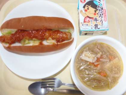 給食 3月1日(木) 公開日 2018/03/01 更新日 2018/03/01 できごと 今日の献立は、チリドッグ、牛乳、やさいスープです。チリドッグは、新メニューです。チリソースは手作りで作りました。にんにく、たまねぎを炒めてピザソースとチリパウダーを入れます。お店で売ってるようなチリドッグをイメージして、たまねぎを荒みじん切りにしました。ピリ辛ですが、ホットドッグと一味違うソースと味で目新しい感じでした。ボイルキャベツを一緒にはさんで食べました。 いいね(0)