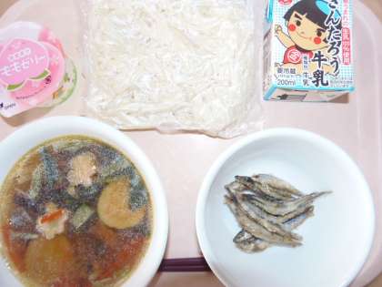今日の献立は、ひなまつりうどん、きびなごのからあげ、桃ゼリーです。ひなまつりうどんは、鶏肉、しめじ、にんじん、山菜、梅なると、長ねぎ、こまつな、花麩が入っていて、梅なると、花麩がひなまつりらしさを出した食材になっています。桃の節句ということもあって、桃ゼリーもつきました。
