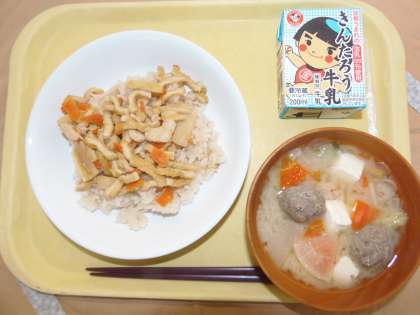 今日の献立は、こぎつねごはん、牛乳、つみれ汁です。つみれは、いわしのつみれが入っています。ご家庭で汁物の献立を考えられる際は、冷蔵庫にある野菜に練り物をひとつ加えることで、良い味が出て、メニューに変化も出ます。つみれを手作りしても美味しいですよ。