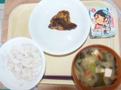 今日の献立は、麦ご飯、牛乳、鶏肉のゆかり揚げ、なめこ汁です。鶏肉のゆかり揚げは、ふりかけとしてよく使う「ゆかり」を、鶏肉に漬け込み、かたくり粉をつけて揚げます。揚げるとゆかりが黒くなってしまいますが、食べるとほわっとゆかりの香りがします。給食では、全ての食材を加熱しないとならないので、漬け込んで揚げていますが、塩で下味をつけて揚げた後、ゆかりをパラパラとかけて食べても美味しいと思います。