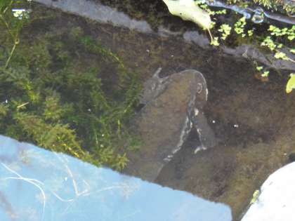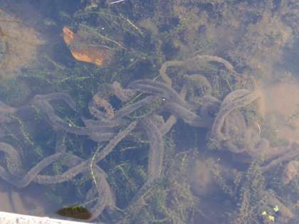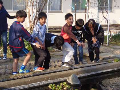 3月13日(火)の放課後、ウォーターランドから子どもたちの元気な声が聞こえてくるので「どうしたの」と声をかけたところ、3年生の子どもたちが「大きなカエルと卵がある」とのこと。近づいてみると、なるほど水路の中に大きな卵と、これまた大きなカエルの姿がありました。カエルも卵も、他の生き物たちも、やさしく見守ってあげましょうね。