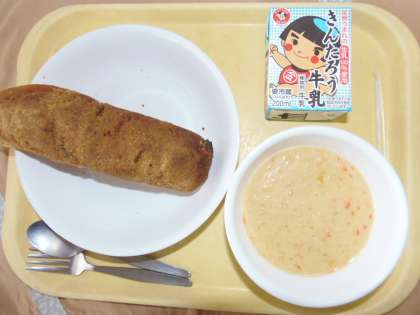 今日の献立は、きなこレーズンロール、牛乳、コーンポタージュです。今日のコーンポタージュは、パン粉をカリカリするまで初めに炒めて、その後にたまねぎ、にんじんを炒めました。パン粉が入ることで、とろみが出てふわっとしたポタージュになります。ご家庭であれば、余った食パンを細かく切ってフライパンで炒ると、手作りクルトンになります。ポタージュの最後に入れて混ぜながら食べるのも良いと思います。