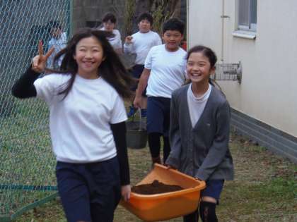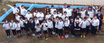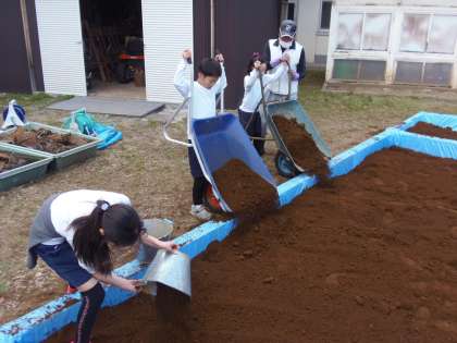 3月15日(木)午後、田んぼプロジェクトが完成しました。倉庫跡のがれきを4年生と校務用員さんが片付けてくれたので、そこにブルーシートを敷き詰めました。今日は4年生が全員で赤土を運び入れる作業を行いました。昨日届いた赤土でしたが、4年生の力ですっきりと運び入れることができました。来年度はきっと立派なお米を収穫することができることと思います。4年生のみなさん、ありがとうございました。
