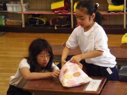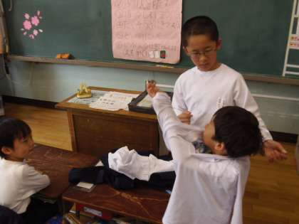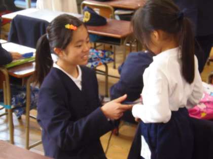 毎朝、6年生が1年生の教室を訪問し、登校後の着替えや学習準備等のお手伝いをしています。1年生はお兄さんお姉さんのお世話を受けながら笑顔で行動し、学校生活に慣れ始めています。お世話する6年生の表情も日々成長し、より6年生らしくなってきました。